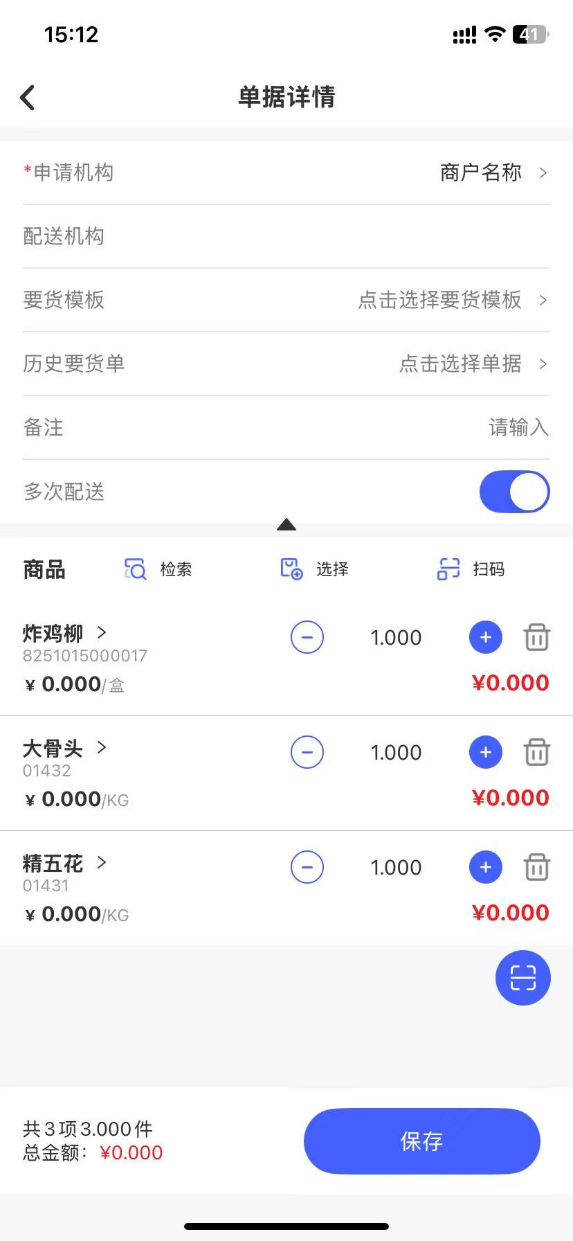 使用操作:门店通 -- 【应用】--【配送管理】--【统配申请单】--【新增单据】--【多次配送】