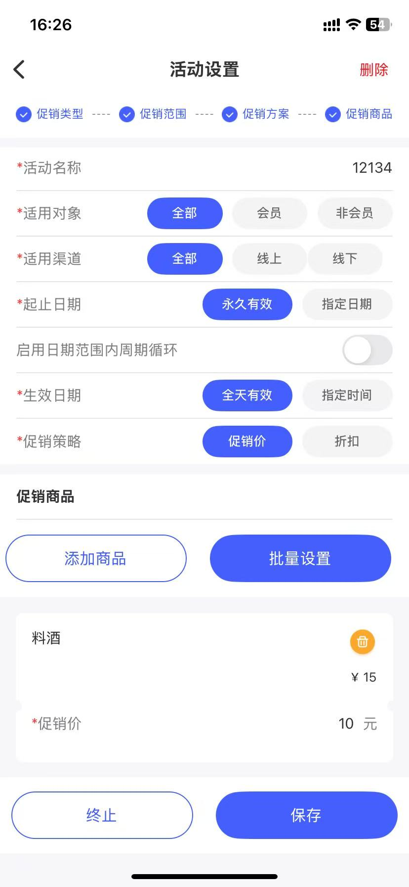 使用操作:门店通 -- 【应用】--【促销活动】--【单品促销】--【批量设置】