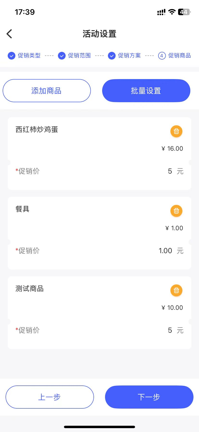 注意事项:必须先选择商品,再点批量设置,当批量设置促销价格时,原商品金额低于促销价,该商品不会生效