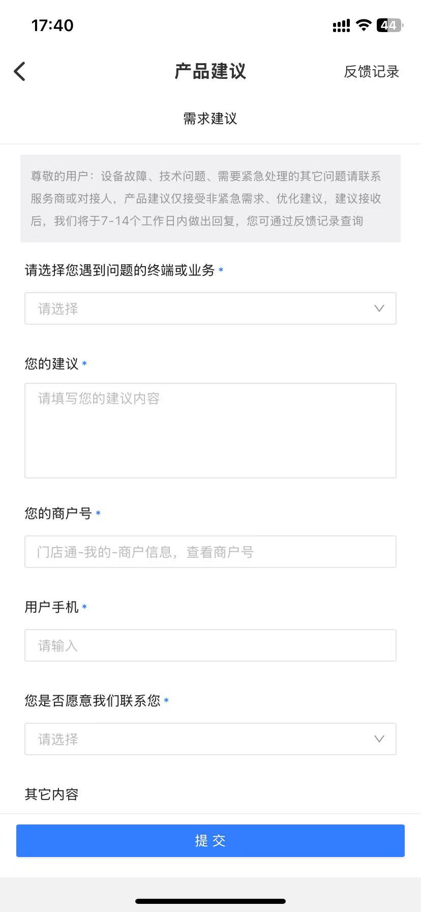13、新增“ 商户意见建议反馈机制”