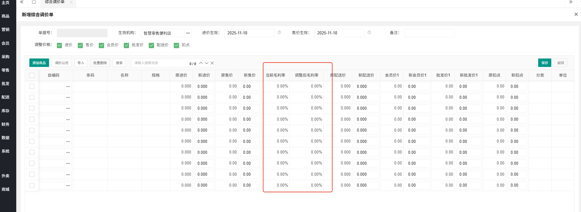 2、基准价格包含:进价、售价、配送价、批发价(1-5)、会员价(1-5)