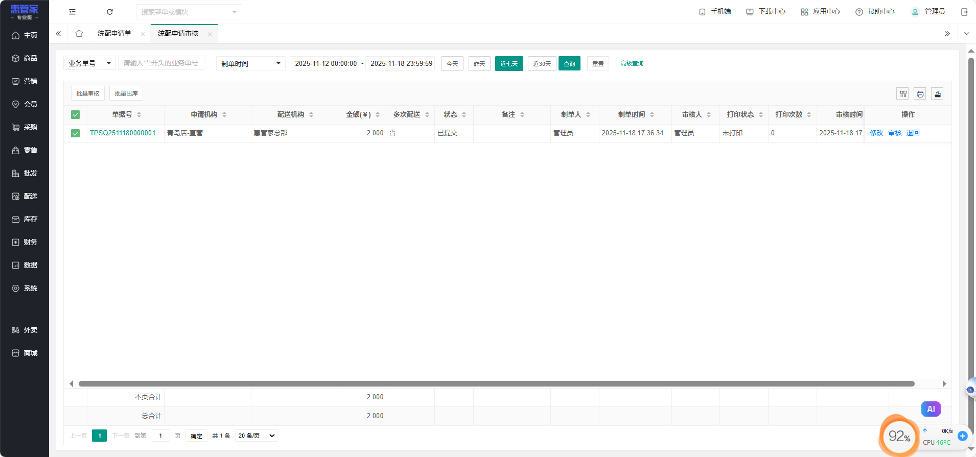 使用流程:后台 --【配送】--【统配申请审核】--【批量出库】