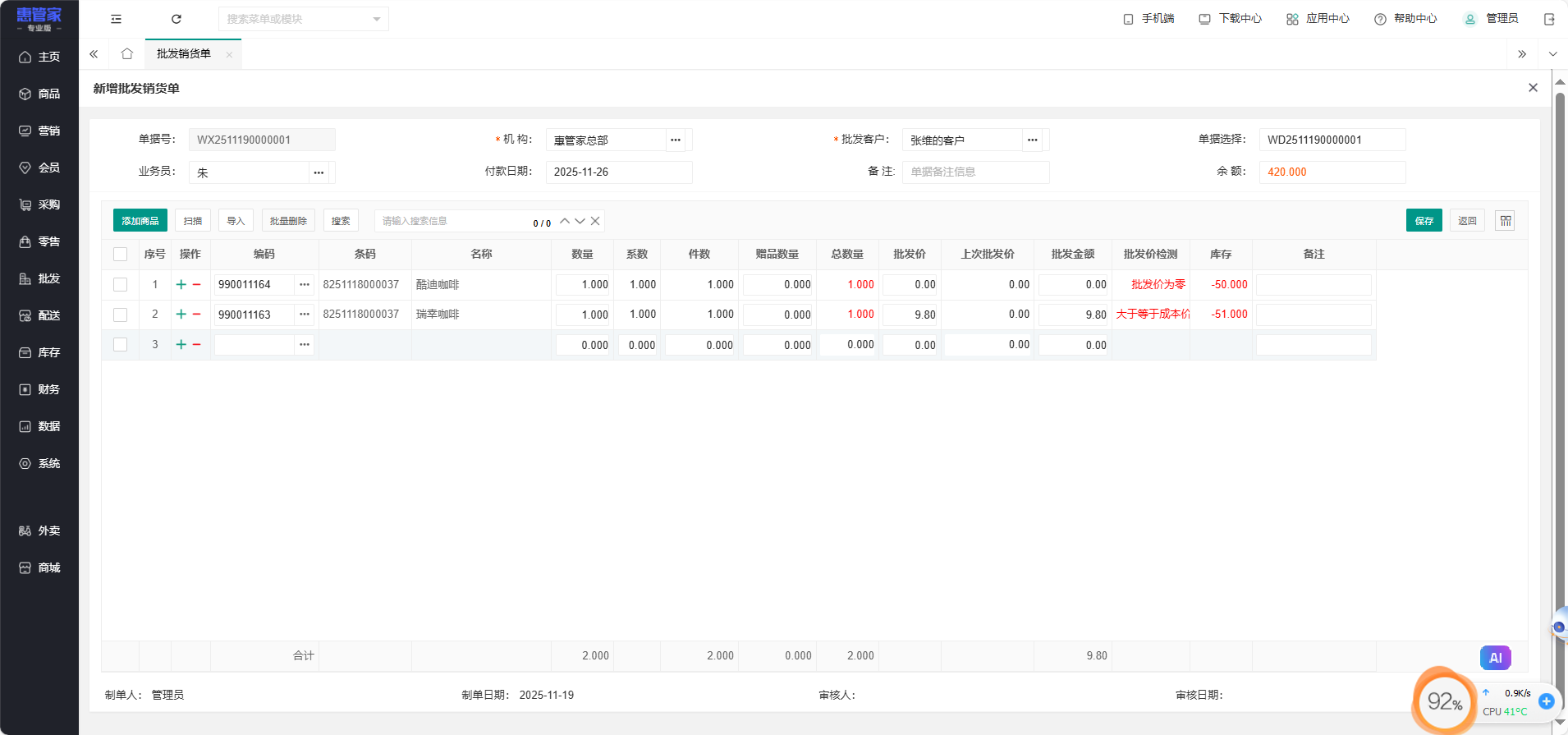14、批发销货单和批发退货单增加批发客户实时余额显示