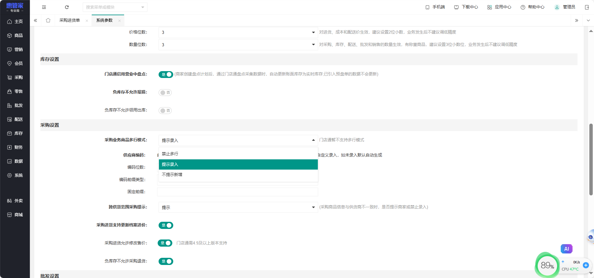 使用流程:后台 --【系统】--【采购设置】--【采购业务商品多行模式】--【禁止多行】/【提示录入】/【不提示新增】